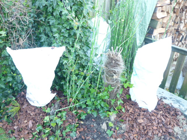 hallo , ik ben dan ook maar gestart met de winterbescherming van mijn trachys . bij de kleintjes heb ik een veevoederzak overheen getroken en bij de groote een big bac van bouwmaterialen , kwa struktuur zijn die het zelfde (geweven plastiek vezels ) er door regenen gaat niet maar de nate binnen in kan wel verdampen en verluchten door de kleine gaatjes .rond alle stamen heb ik een mooie laag schors aangebracht , hoopelijk komen ze goed de winter door , voor vele word het de eerste winter in de volle grond :)