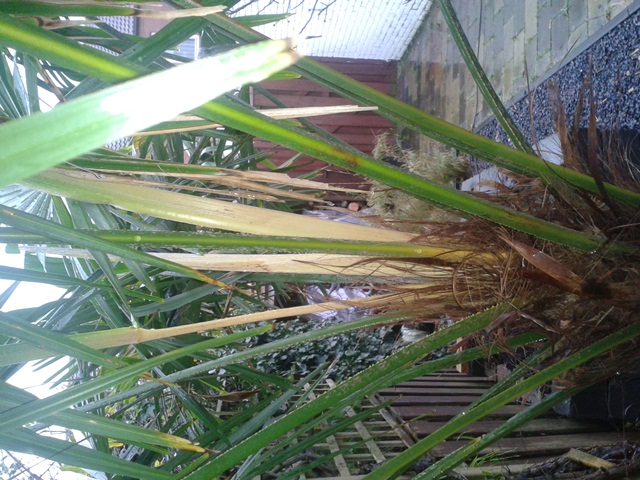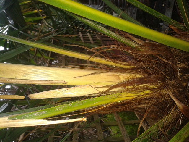 afgelopen jaar hebben mijn 2 fortunei trachycarpus het goed gedaan, veel nieuwe speren. alleen sinds een maand zijn de speren geel geworden, zie fotos. het is sinds het een stuk vochtiger is geworden. om de stam heb ik lichtsnoeren gedaan voor de versiering. zou het kunnen dat door de vocht en warmte van deze lichtsnoeren schimmel of iets is ontstaan.