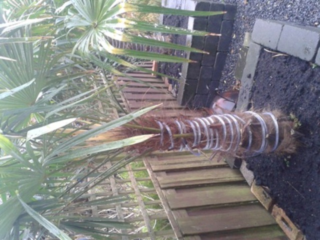 Verbazingwekkend dat mensen hun Trachycarpus verwarmen, terwijl de meeste exemplaren hier de voorgaande winter -20°C zonder enige vorm van protectie hebben overleefd. Alleen bij mijn exemplaar ging dat mis, maar dat was mede 't gevolg van een korte felle brand die ontstond toen in 't voorjaar de loodgieter, die met een dakreparatie bezig was, zijn gasbout op de kop liet vallen. Gewoon goed inpakken deze palm met luchtdoorlatend isolerend materiaal is meestal voldoende eventeel voorzien van een afdak. Het klassieke materiaal is een rietmat of een omhulling met stro. Daarnaast is er scala aan moderne materialen beschikbaar.