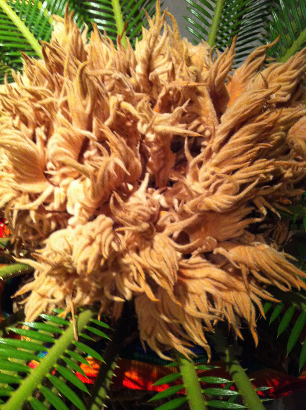 Dat fluffy gedoe is omdat die gaat bloeien of gebloeit heeft. En het is geen boomvaren maar een cycas ofwel palmvaren ;) Ik zou de kruin toch los laten zodat die meer licht kan opvangen met de bladeren. En wat bedoel je juist met de onderkant in stukken uitgevallen ? Bedoel je stukken uit de stam ofzo :onzeker: Als die echt kletsnat staat zou ik hem ofwel vrij warm zetten zodat die veel kan verdampen ofwel zou ik hem toch verpotten in droge grond en meteem controleren op rot e.d.