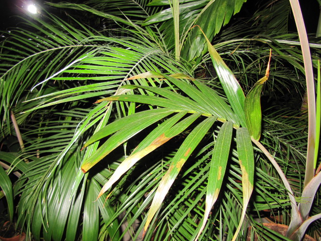 Ik heb een hyophorbe lagenicaulis die al bijna 2 jaar bij mij in de serre staat en het altijd goed gedaan heeft tot 2maanden terug, en nu zijn een aantal bladeren tot de helft toe verdroogd/bruin), de oudere bladeren hebben het erger dan de nieuwe (heb foto s proberen te plaatsen maar dat lukt niet), maar ook de nieuwe bladeren hebben er al een beetje last van. Hij groeit wel nog met een nieuwe speer. De omstandigeheden zijn (in die 2 jaar) niet veranderd, miniem temp 15 graden en luchtvochtigeheid meestal rond de 60%, ook geen beestjes (of spint) op of ander de bladeren te zien. Wat kan hier de oorzaak van zijn?
