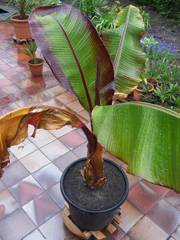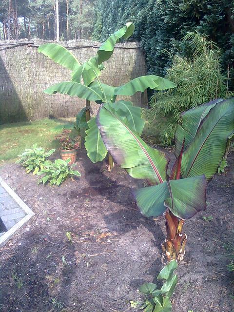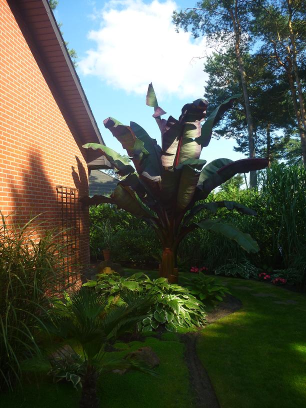 in de zomer van 2009 zijn alle bananen,hostas enz. verwoest door een nooit geziene hagelbui. Tegen half september hadden de bananen toch weer een paar mooie bladeren aangemaakt.