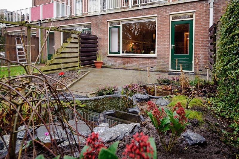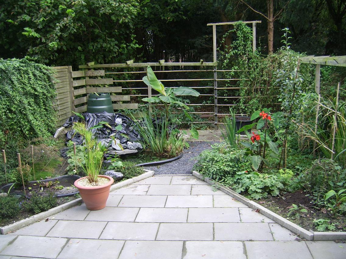 Achter heb ik alles weggehaald, alles is opnieuw bestraat, ik heb een vijver en een moerasje voor mijn vleesetende planten aangelegd. Voor het eerst met exoten anders dan bamboe in volle grond geëxperimenteerd: Musa sikkimensis, cyperus papyrus, Colocasia esculenta, Canna, Dicksonia antarctica, Passiflora "Purple Haze".