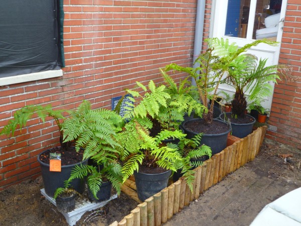 de gele naamplaatjes verklappen al dat ik een bezoekje mocht brengen bij Eduard , een leuke verzameling boomvarentjes gekocht . ik hoop ze ook zo hoog te krijgen als zijn exemplaren dit was een van de unieke momenten dat ik niet door de knieen moest maar omhoog moest turen om de veren te aanschouwen