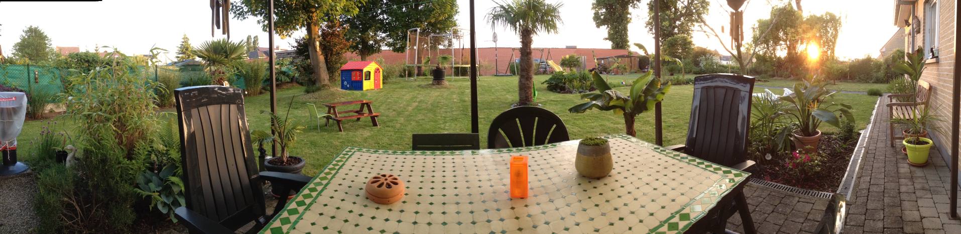 Ik ben me aan het verdiepen in professionele panoramafoto's, dus ik heb een goede panoramakop gekocht, voor de tuinfoto heb ik 17 foto;s gemaakt met mijn 16 mm fish eye en 1 van de lucht, daarna maak je met behulp van het programma PT Gui een panorama, dit programma "naait" alle foto's aan elkaar, zo kan je met quicktime 360° rond kijken, maar in datzelfde programma kan je dus ook die bolvorm maken. Zolang je goede panoramafoto's hebt die overlappen kan je er een hoop mee doen. Kost een paar centen maar dan heb je ook wat, maar goed fotograferen is mijn werk.