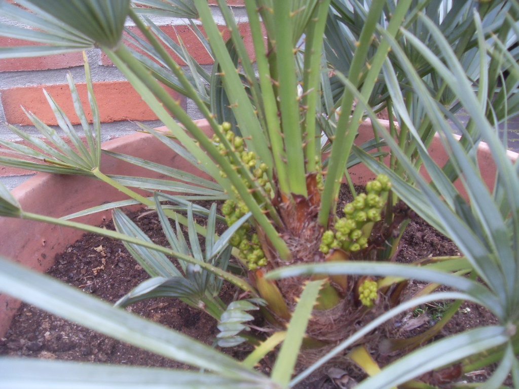 Hier ook een Chamaerops met een stam van bijna 50 cm die sinds 3 jaar niet meer bloeit, maar wel als een raket groeit. Ben de tel alweer kwijtgeraakt, maar zit nu al ruim over de 15 nieuwe bladeren.