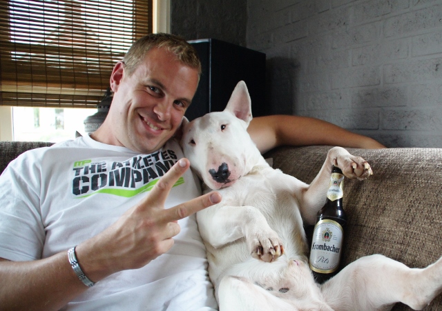Ik zag dat Luc ook een Duitse dog heeft. Hier loopt er ook zo'n grote lieve jongen van zo'n 85kg, en een fantastische waakhond. We hebben ook een geweldige Bullterrier, de clown hier!
