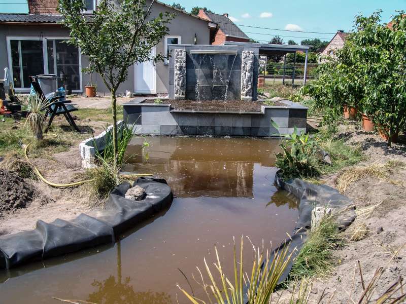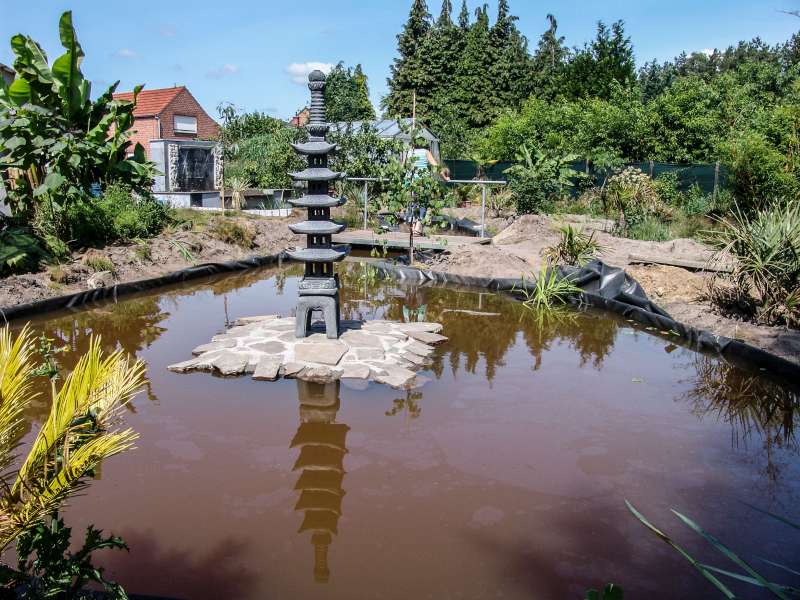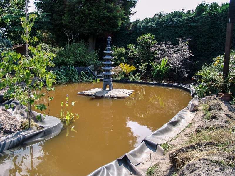 Vijver is gevuld. Jammer genoeg blijkt het ijzergehalte in het water veel hoger te zijn dan ik dacht waardoor het water rossig bruin van kleur is en je geen dieptezicht hebt maar er is me verteld dat dit na 2-3 weken zou wegzakken naar de bodem en het water daarna veel helderder zou zijn.