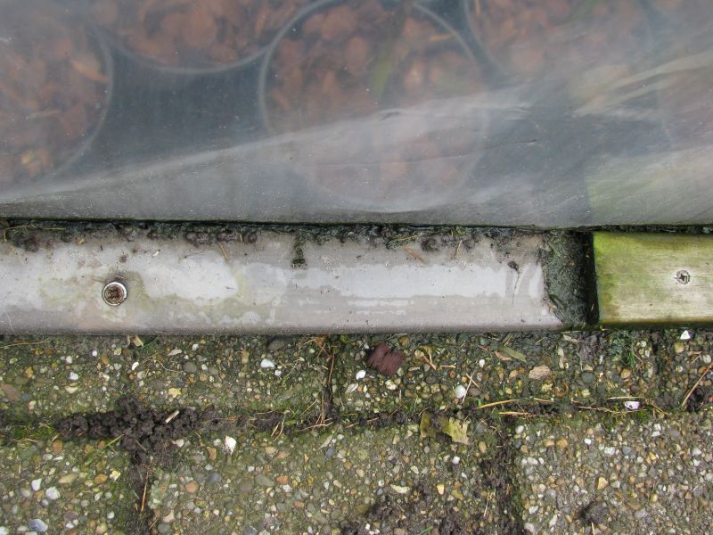 De folie is rond een houten lat gedraaid, en deze is met slagpluggen in de beton en klinkers vast gemaakt. Dan zie je rechts boven de houten lat met folie nog een houten lat. Het is allemaal in geïmpregneerd hout.