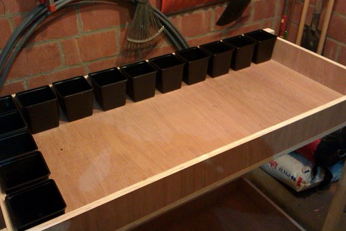 Deze bakken(en) zijn 60x122cm met hoge rand vaan 10cm en een totale hoogt van een meter. Ze is gemaakt uit 18mm multiplex(water vast gelijmd). De bedoeling was om de kleine zaailingen vanboven te zetten om deze wat meer in het oog te houden mits deze toch wat meer aandacht nodig hebben. Die worden ook nog geschilderd met duol satin van levis. En ik moet nog iets uitdokteren i.v.m. een waterafvoersysteem anders blijft het water in de bak staan. Iemand een idee?