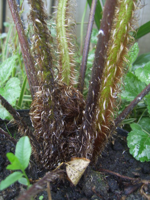 ongeveer een 5 jaar geleden heb ik een dicksonia ant. aan de vijver in volle grond geplant, deze gaat Ongelooflijk , heeft een stammetje van 20 cm aangemaakt met ja, raar maar waar 2 koppen en op de zijkant een 3de kop, :shock: zie laatse foto's.