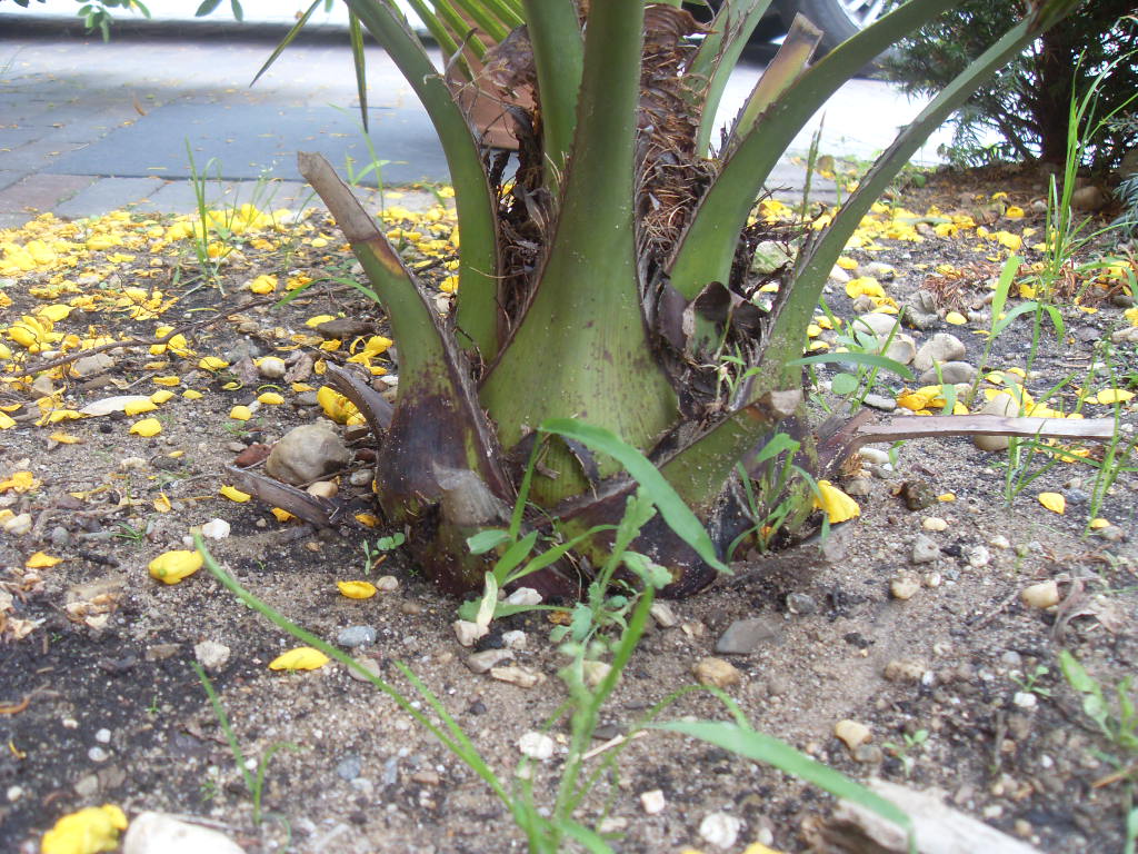 Overigens heb ik wat vederpalmen betreft een forse butia al vier jaar in de grond en die maakt idd ook polsdikke speren aan. En die speren komen eerst naar boven en vouwen dan pas uit tot blad. Maar zoals je op de foto ziet, doet mijn Jubaea dat anders. maar dit is ook nog een klein exemplaar.