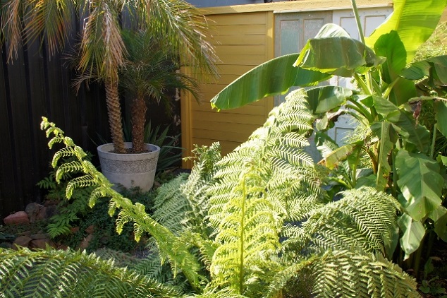 Inderdaad mooie exotische tuin met een rustige uitstraling, zie wel dat je veel direct in de zon hebt gezet [brandschade!] als planten langzaam wennen hoeft dat niet te gebeuren, en ja boomvarens liever helemaal geen zon in de middag uren of halfschaduw / schaduw, dan doen ze het op zijn best ;)