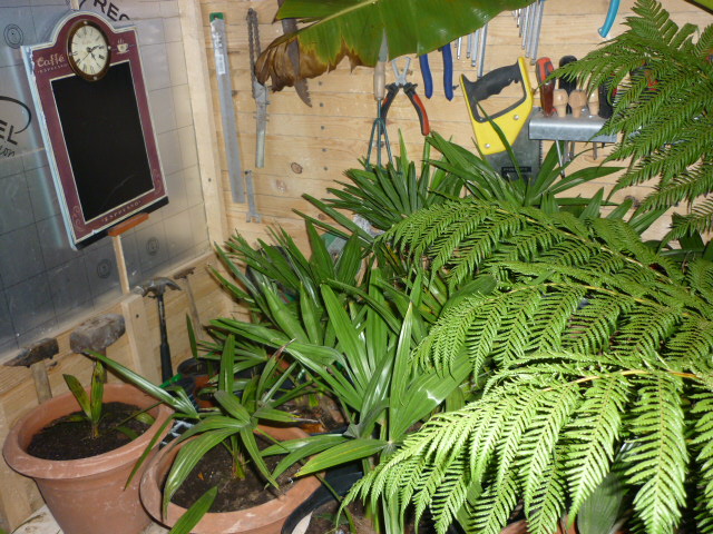 hallo ; na de koude nacht van zondag dan toch maar beslist van alles naar de winterstaling te doen. het was me weer een hele taak ,ik had ze liever nog wat laten staan maar als je ze plots s'avonds na je werk in het donker ze moet uitgraven en versleuren dan kom ik tijd te kort en vorig jaar stond alles er al 2weken er in en ook geen problemen gehad .enkel de robusta staat nog buiten om dat de luchtvochtighied binnen niet ze goed is (weet iemand de goede vochtigheid voor een robusta ) volgnden keer zal ik beter na denken voor ik iets bij koop .olgend jaar mag hij de volle grond in maar eerst de winter door krijgen ik had meschien gedacht er een groote transparante zak er over te doen om zo de vochtigheid wat hoger te krijgen dan in de keuken met centeraleverwarming die nietgoed is blijkbaar voor de plant gewoon besproeien zou meschien ook kunnen werken het word nog een spannende winter