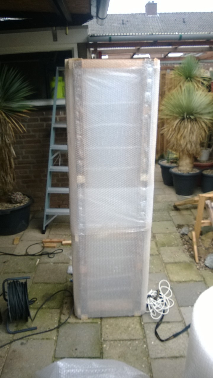 Dan de plant met meerdere lagen noppen folie voorzien, stelling erom heen en weer dik zeil om de stelling :thumb_up: