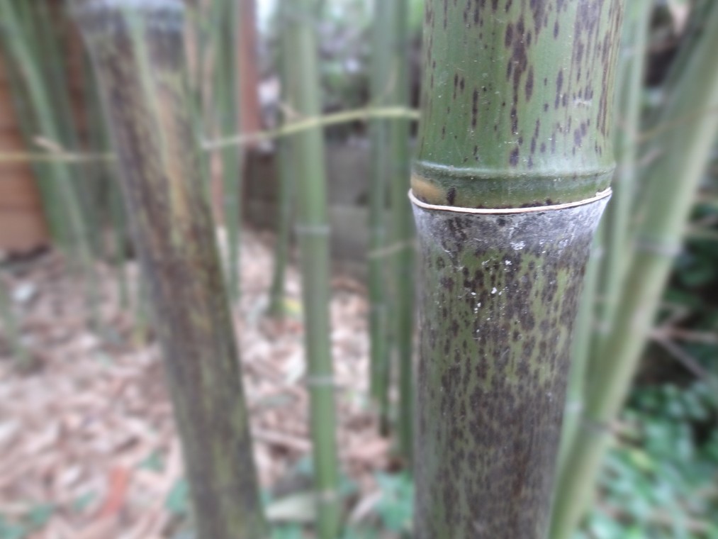 Bij nadere inspectie heb ik een vergelijkbare vlektekening ontdekt bij enkele spontaan ontwikkelde halmen Phyllostachys vivax 'Huanwenzu'. Lastig te fotograferen en hopelijk is het te zien.