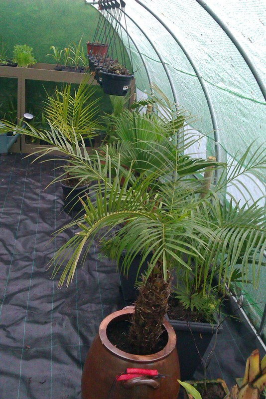 Wel een voordeel: Jubea bladeren blijven veel langer mooi - hier zitten de balderen van de aanschaf in 2012 er nog op... Jubea heeft wel gewoonweg heel veel warmte nodig, dus elke graad celisus en beetje zon is welkom.