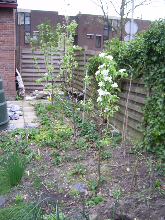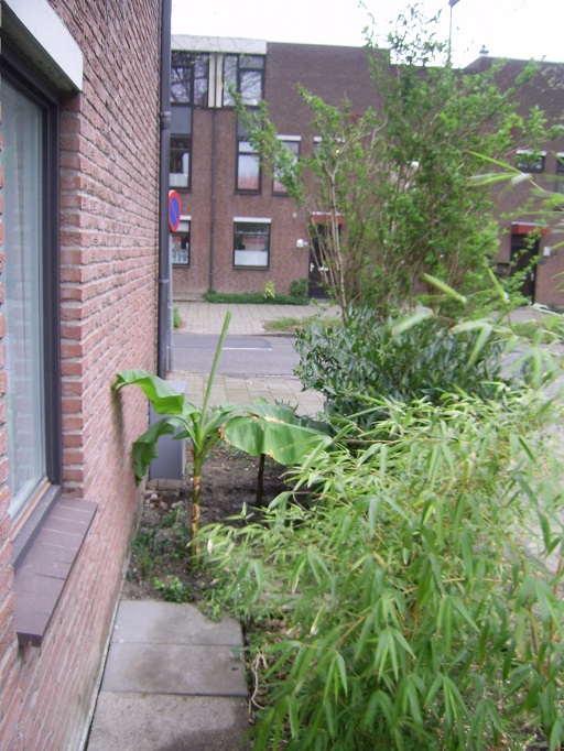 De Musa's naast mijn huis. Ook een basjoo en een sikkimensis maar zoals gezegd kleiner dan de Musa's in mijn achtertuin. Verder heb ik in de herfst van 2013 een Albizia julibrissin geplant. Dit keer gelijk maar een grote omdat ik er al één verloren ben en grote exemplaren een betere overlevingskans schijnen te hebben. Tot nu toe lijkt dat inderdaad het geval. Hij begint voorzichtig al weer wat uit te lopen maar valt op de foto nog volledig weg tegen de struik die erbij staat.