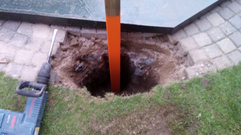 Gaten maken voor de 4 palen die het dak moeten lieren, wat heb ik een spijt dat ik destijds met het maken van het zwembad zo verschrikkelijk veel beton heb gestort om de wanden, ik ben echt 3 dagen aan het beton hakken geweest om de palen te kunnen zetten. Daarna dacht ik eventjes totaal aan 1 kub beton genoeg te hebben om de palen strak aan het zwembad te zetten, dat werd 3 kub beton storten, maar het beton met de palen zit nu vast geankerd met betonijzer aan het zwembad. Mocht ik ooit verhuizen dan wordt dat een leuk klusje, het bad met palen en dak moet er in 1 geheel uit of het word sloop haha.