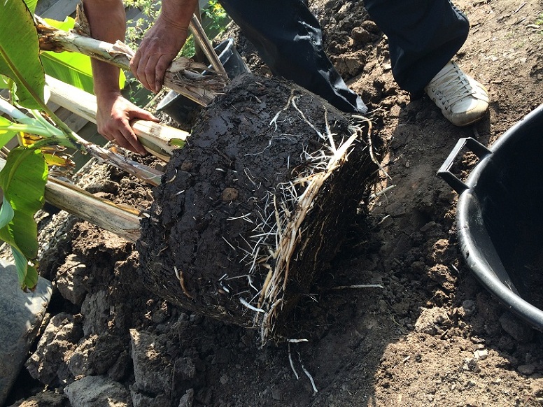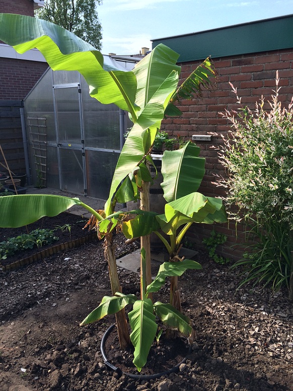 Ik denk dat Musa veel harder groeit als de wortels vrij op zoek kunnen naar water en voeding en niet opgesloten zitten in een kuip. En volgens mij heeft een Musa er weinig last van als je die wortels in de herfst afsteekt om op te potten en binnen te overwinteren.