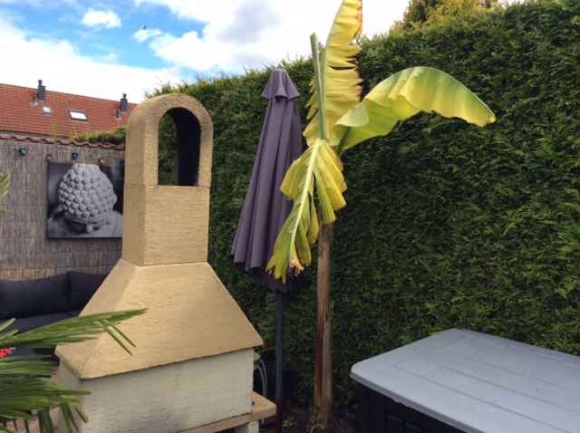 Op de achtergrond een musa basjoo met meerdere stammen in een grote regenton. Elk jaar voor de winter gaat al het blad eraf en een deel van de stammen om vervolgens in het schuurtje te overwinteren.