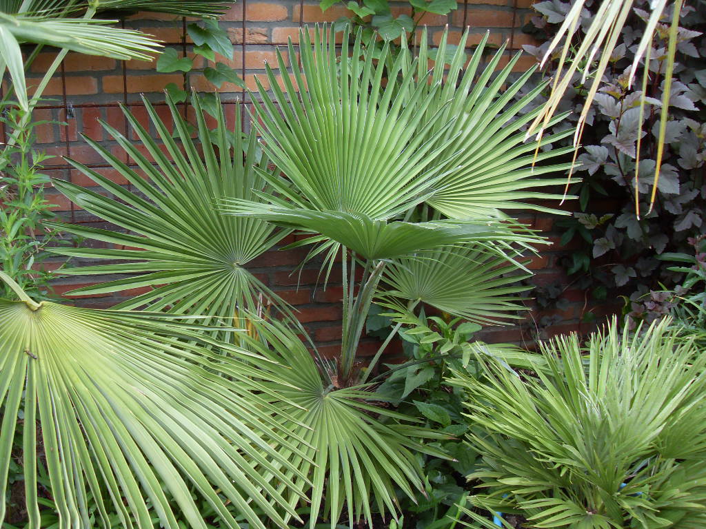 Je zou toch vermoeden dat de variabele kweekresultaten met Trachycarpus princeps te maken hebben met de genetische variatie van het wilde zaad. De 3 exemplaren die hierbij staan afgebeeld heb ik inmiddels een jaar of 5. Ze hebben dezelfde leeftijd, maar de groeiresultaten zijn zeer verschillend. Een vierde exemplaar staat in de tuin en is eens als een Fenix uit z 'n as herrezen, i.e. het vaker beschreven fenomeen dat de kruin verging en een nieuwe jonge scheut uit de grond opkwam.