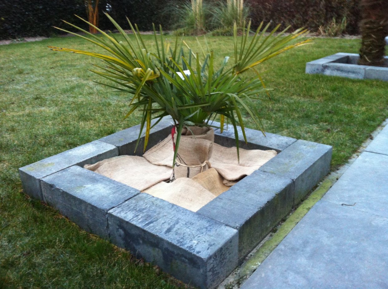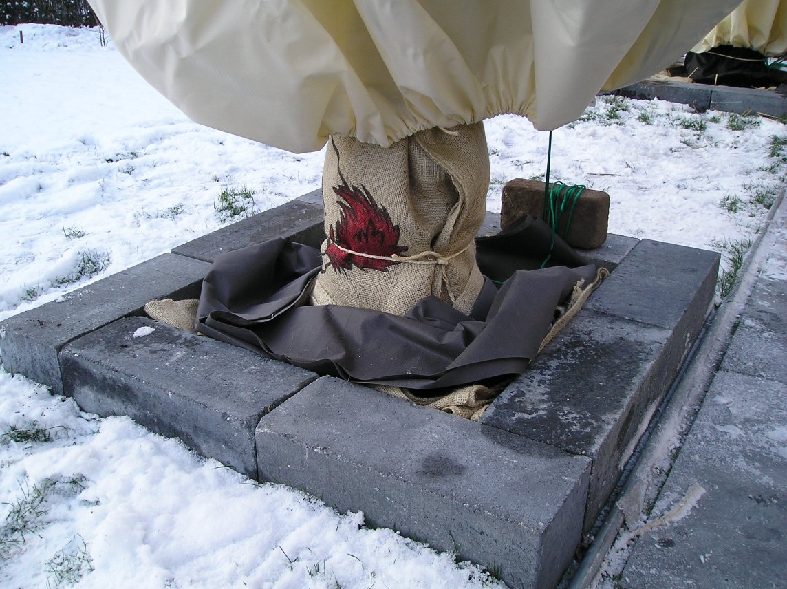 Tip 4: toch maar beschermen vd winter. Het is al augustus. Maar een paar graden vorst kan best. Normaal beschermen met vliesdoek, maar nu (omdat ze klein zijn) kan jutezakken ook. Bodem en stam afdekken.