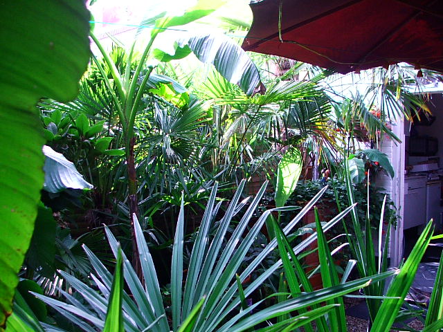 en ik van daaruit zo in de tuin kijk. links zie je nog net een ensete maurelli achter de paal staan wiens hoogste blad op 4 meter hoogte zit.