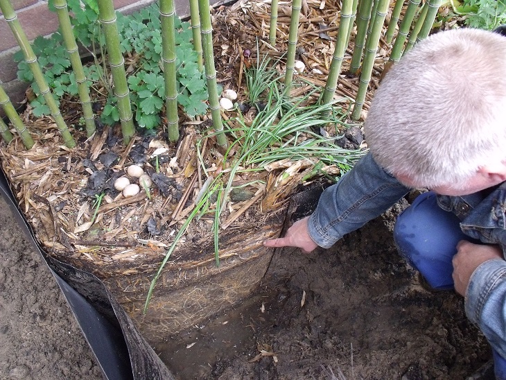 nou om even terug te komen over de rizomen , toetste al eerder dat ik verleden jaar de ph-atrovaginata had uitgebreid , dus meer ruimte heb gegeven, ( zag vanmiddag dat de rizomen groei in volle gang is ) had ik foto ervan gemaakt toen, je kan hierop duidelijk zien dat boven de rizomen groeien en de haar wortels veel dieper gaan, die haar wortels zijn geen rizomen,en worden dat ook niet, rizomen zijn veel dikker en daarop groeien die halmen , die haar wortels nemen voeding en water op, je ziet duidelijk dat het zo rond de 30 cm diep gaat die rizomen, tja , wilde het even laten zien , m.v.g. paul.