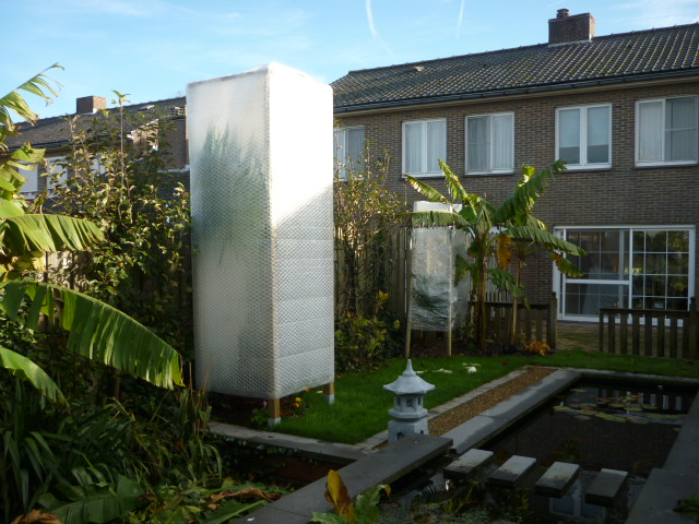 deze nacht de eerste grond vorst in vlaanderen . daarom is gisteren bijna alles in de winterstaling gegaan en de rest ingepakt .het word de eerste winter voor de robusta ik heb de thermostaat op 1graad gezet ,zodra hij er onder komt schiet de gloeilamp en de warmteblazer aan tot hij weer die 1 graad bereikt. hopelijk word het de zelfde winter als vorig jaar. ik heb dit jaar ook een terras rond het tuinhuis geplaatst ,wel vijf jaar te laat maar ja , alles op zijn tijd .de scheuten van de basjoo's waren dit jaar behoorlijk groter dan andere jaren