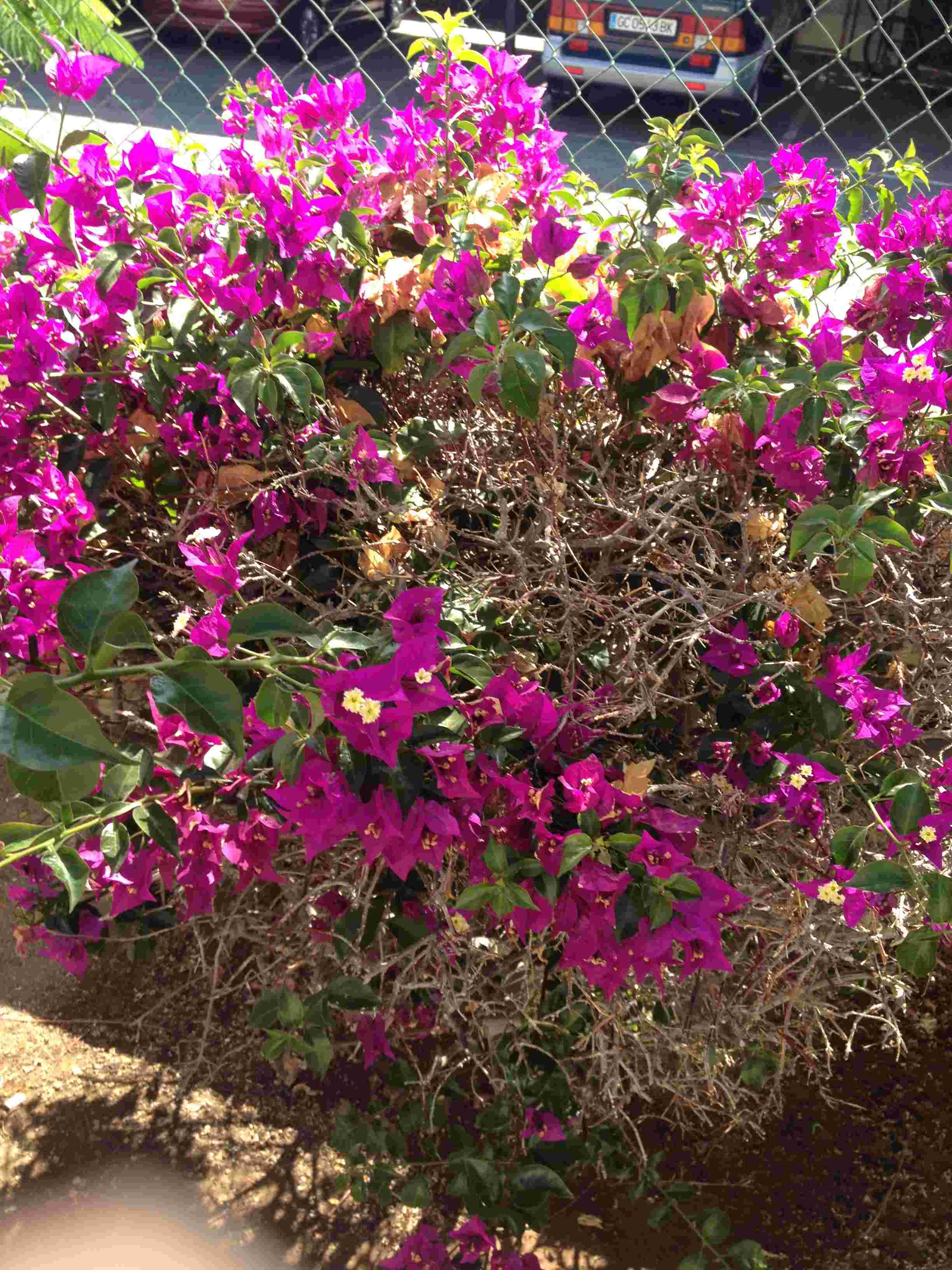 Wie weet hoe deze bijzonder kleurrijke struiken heten? Op de bijgevoegde afbeeldingen in paars en rood, maar ze zijn er ook in wit en geel/oranje. De Canarische eilanden staan er vol van. Het zijn soms eigenstandige struiken en vaak zie je ze over hellingen en schuttingen hangen. Kon helaas geen zaden ontdekken bij ze, anders had ik dat wel meegenomen.