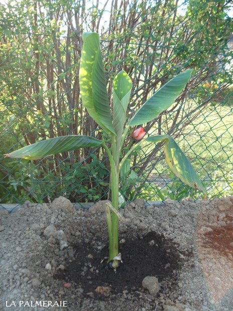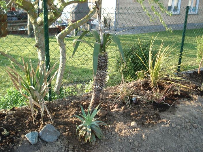 De Trachycarpus wagnerianus, nu nog met pot en al ingegraven en versteviging aan de voet omdat hij nog niet veel wortels heeft. Deze winter bescherm ik hem om hem volgend jaar definitief uit te planten.