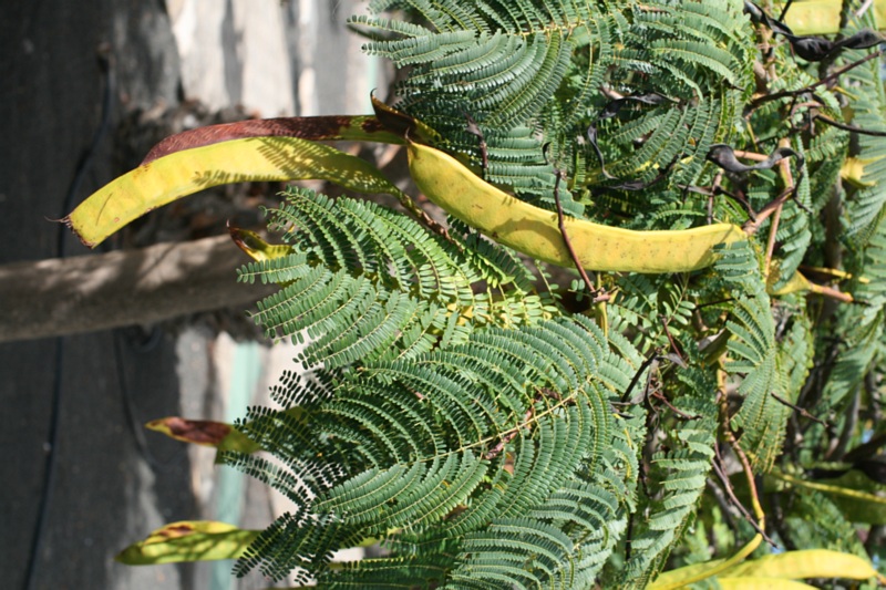 Die met de fijne blaadjes en lange zaaddozen zou de Delonix regia kunnen zijn