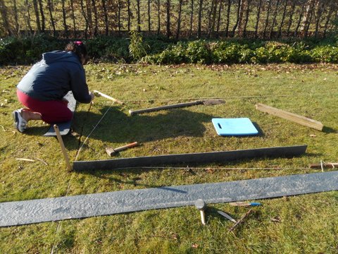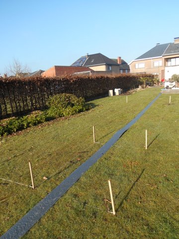 Op het plaatje komt de tweede uitgraving tussen zonnewijzer en vogelhuisje te liggen. In de grond ga ik polysterene platen aanbrengen om de wortels tegen vorst te beschermen.