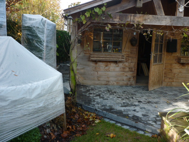 deze nacht de eerste grond vorst in vlaanderen . daarom is gisteren bijna alles in de winterstaling gegaan en de rest ingepakt .het word de eerste winter voor de robusta ik heb de thermostaat op 1graad gezet ,zodra hij er onder komt schiet de gloeilamp en de warmteblazer aan tot hij weer die 1 graad bereikt. hopelijk word het de zelfde winter als vorig jaar. ik heb dit jaar ook een terras rond het tuinhuis geplaatst ,wel vijf jaar te laat maar ja , alles op zijn tijd .de scheuten van de basjoo's waren dit jaar behoorlijk groter dan andere jaren