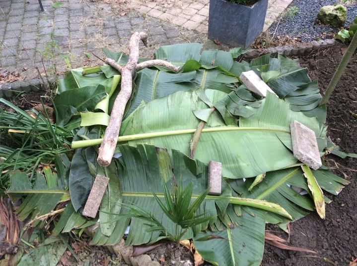 Vandaag de bescherming aangelegd voor de Gunnera tinctoria ;) Deze laag bestaat uit een laag canna blad, vervolgens laag blad uit het bos, weer een laag canna blad en vervolgens weer een laag blad uit het bos. Dit afgedekt met bigbagzakken en voor het zicht een laag bananenblad. Waar we toch genoeg van hebben :)