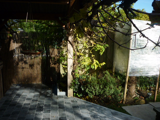 deze nacht de eerste grond vorst in vlaanderen . daarom is gisteren bijna alles in de winterstaling gegaan en de rest ingepakt .het word de eerste winter voor de robusta ik heb de thermostaat op 1graad gezet ,zodra hij er onder komt schiet de gloeilamp en de warmteblazer aan tot hij weer die 1 graad bereikt. hopelijk word het de zelfde winter als vorig jaar. ik heb dit jaar ook een terras rond het tuinhuis geplaatst ,wel vijf jaar te laat maar ja , alles op zijn tijd .de scheuten van de basjoo's waren dit jaar behoorlijk groter dan andere jaren