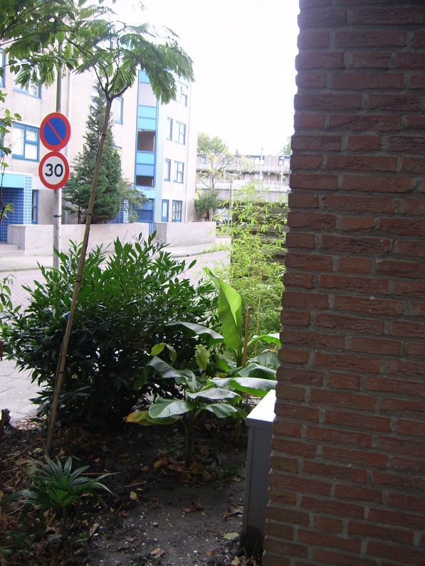 De Musa's naast mijn huis. Ook een basjoo en een sikkimensis maar zoals gezegd kleiner dan de Musa's in mijn achtertuin. Verder heb ik in de herfst van 2013 een Albizia julibrissin geplant. Dit keer gelijk maar een grote omdat ik er al één verloren ben en grote exemplaren een betere overlevingskans schijnen te hebben. Tot nu toe lijkt dat inderdaad het geval. Hij begint voorzichtig al weer wat uit te lopen maar valt op de foto nog volledig weg tegen de struik die erbij staat.