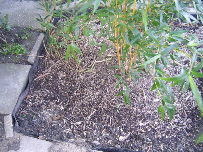 De Phyllostachys aureosulcata aureocaulis heeft bovengronds nog niet veel gegroeid afgelopen jaar, maar ondergronds des te meer! Bij aanschaf was de kluit al zwaar doorworteld en bij aanplant heb ik de rhizomen wat uitgespreid. Maar desondanks toch wel imponerend dat hij in een paar maanden tijd al bij de rhizoombegrenzer is aangekomen en langs de folie naar beneden duikt. Ik weet dat de ruimte die mijn bamboes krijgen eigenlijk te klein is maar meer ruimte wil/kan ik ze niet geven. Dat wordt dus flink terug snoeien. Nieuw aangeplant maar op de foto's nog nauwelijks zichtbaar zijn onder andere 2 Pawpaw boompjes en Lobelia "Queen Victoria" en verder heb ik wat planten verplaatst omdat er vorig jaar nog een berg grond op hun plaats lag. Gunnera begint uit te lopen. De Gunnera waarvan ik nog niet zeker ben of het manicata is heeft 2 bloeiaren gemaakt dus ik hoopte dat ik binnenkort meer zekerheid zou krijgen. Maar de slakken hebben flink huis gehouden. Nog even afwachten dus of er iets over blijft dat indentificatie mogelijk maakt. Ik heb een koperdraadje om de plant gelegd in de hoop dat de slakken daar niet overheen kruipen. Eens kijken of het experimentje slaagt.