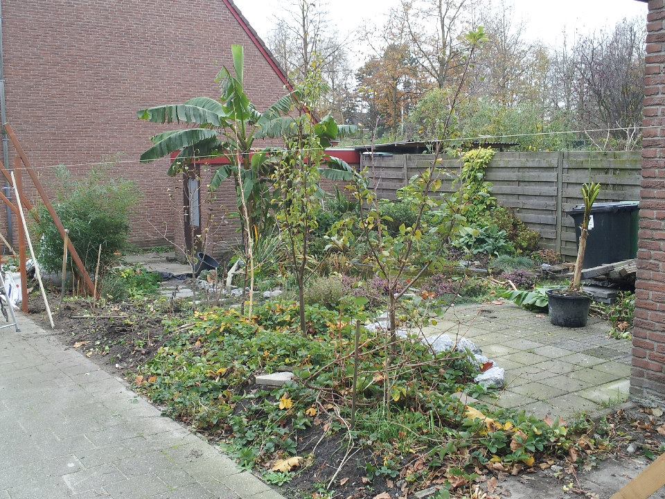 De Musa's naast mijn huis. Ook een basjoo en een sikkimensis maar zoals gezegd kleiner dan de Musa's in mijn achtertuin. Verder heb ik in de herfst van 2013 een Albizia julibrissin geplant. Dit keer gelijk maar een grote omdat ik er al één verloren ben en grote exemplaren een betere overlevingskans schijnen te hebben. Tot nu toe lijkt dat inderdaad het geval. Hij begint voorzichtig al weer wat uit te lopen maar valt op de foto nog volledig weg tegen de struik die erbij staat.