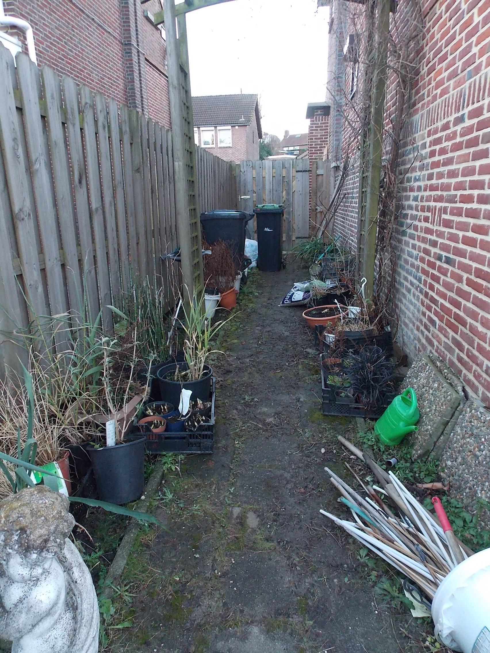 Het is een hoekhuis en ook de zijkant moet helemaal opnieuw gedaan worden. De pergola blijft staan maar er staat een hele oude klimroos in die ik eruit ga proberen te halen. Zal niet meevallen want die staat klem tussen het huis en de pergola. Nu staan even de bakken met planten hier opgeslagen.