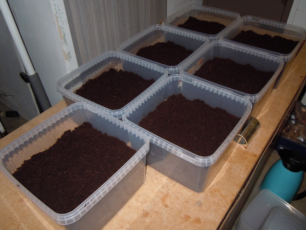Gebruik nieuwe cocopeat. Deze is redelijk steriel en is van zichzelf vochtig genoeg. Ga dus geen extra vocht meer toevoegen na het zaaien. Te nat zal de zaden doen schimmelen en te droog zal geen kieming opwekken. Gebruik afgesloten bakken met deksel of folie met elastiek.