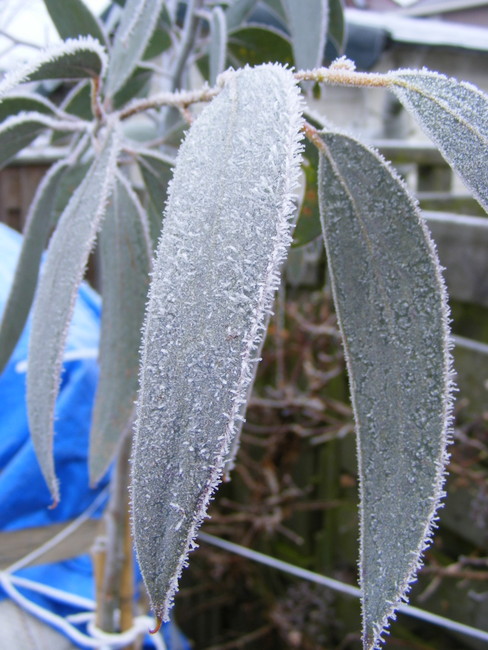 Na een nacht met mist en matig vorst ziet de wereld er anders uit. Trachycarpus wagnerianus heeft zich tegen verdamping beschermd door samentrekking van de waaiers.