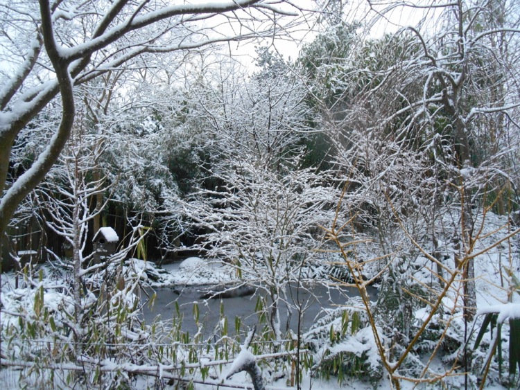 Door de plaksneeuw in Flevoland hangt de bamboe en Trachycarpus bijna tot op de grond.