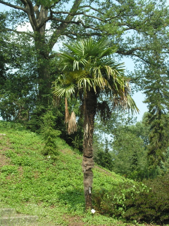 Voor de Amsterdammers, in de achtertuin van Konijnenbrug van gelijknamig tuincentrum in Amstelveen staat ook een flinke knaap, te zien vanaf het tuincentrum. In het westen hebben deze palmen weinig te duchten van de winters. De Trachycarpus van botanische tuin VU had zelfs geen bladschade in 2012. Volgens de hortulanus was de temperatuur er niet onder -10 °C geweest, terwijl de temperaturen plaatselijk in het binnenland onder invloed van een sneeuwdek tot onder -20 daalden. Trachycarpussen verloren daarbij massaal hun blad. Desondanks overleefden er een flink aantal. Zo niet een omvangrijk exemplaar in Dronten. De foto hiervan is onvindbaar, maar de zoektocht in mijn archief leverde wel een prent op van de Trachycarpus op Fort Hoofddijk in 2006. Deze palm stond daar voorheen als kuipplant 's winters in de koude kas, maar werd begin deze eeuw in de volle grond gezet tegen de zuidhelling van het fort. Een uitgeplant exemplaar in de koude kas moest tenslotte worden gesloopt.