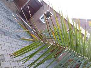 Dat er bladpunten bruin worden buiten is vrij normaal [door weer en wind] het zijn vaak de oudere veren, zolang de hele palm niet bruin wordt is er niets aan de hand! Als je het blad lelijk vind kun je het aan de basis wegknippen.