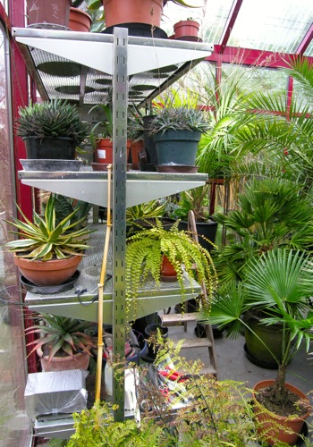 Zoals je op de foto van de te leveren kas (dit is slechts een voorbeeldfoto en niet mijn woning) ziet is het mogelijk tegen meerprijs een tafelgeraamte en zaaikisten aan te schaffen om daarin te plaatsen. Dit lijkt handig maar je verliest daarmee de ruimte boven de zaaitafel. Ik zat dan ook te denken aan een ander systeem, iets met schappen, zodat je alle verticale ruimte benut.