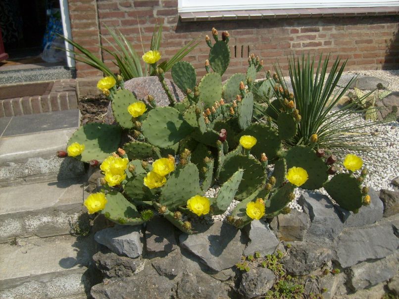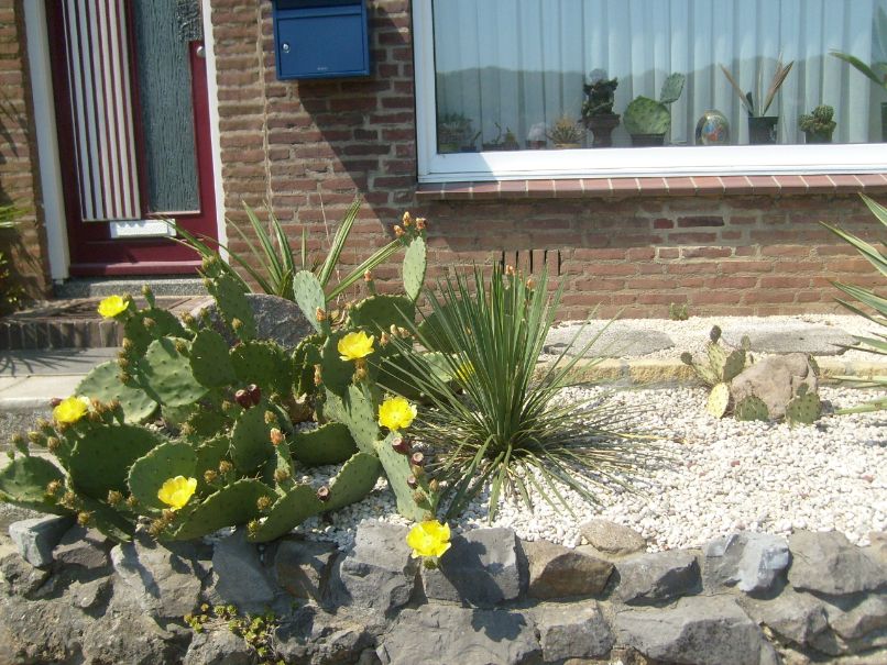 Hier een paar foto's van mijn voortuintje waar de hele dag de zon op staat te branden. De cactussen en alle andere planten worden in de winter niet beschermd maar doen het al jaren goed. Met deze zomer de verrassing dat er 110 knoppen op de Opuntia zitten en er vandaag 15 van bloeiden. Zal ook wel wat met het weer te maken hebben.