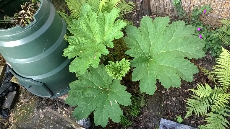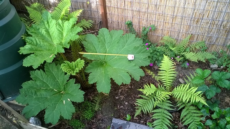 Het grootste blad is nu 80 cm. breed. Niet slecht in 3 maanden vanuit een knop. Hij was wel wat bleek tussen de nerven ondanks mest. Dus ik heb hem nu wat extra "supergroen gazonmest" van Pokon gegeven (met veel stikstof, magnesium en ijzer). Ik ben benieuwd hoe groot hij in 1 seizoen wordt. En nog meer naar hoe het er uit ziet als hij straks over de schutting steekt. En of dat niet wat te gek wordt qua overstekend groen over het voetpad.