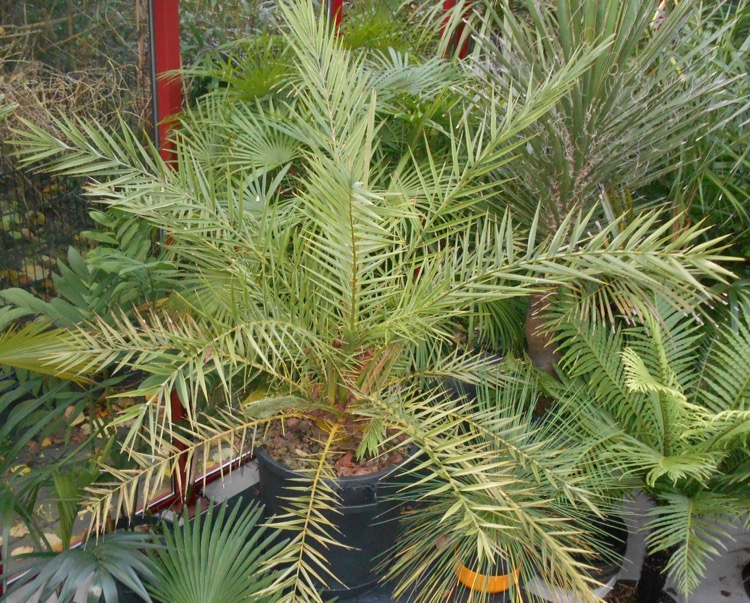 Knap dat je die eruit pikt, Gilean. Tenminste als je de bruine pot naast de rode onderschotel op de voorgrond bedoeld. Dit is Butia paraguayensis (Butia arenicola) 1 van 2 stuks en het kleinste exemplaar. Het andere is al verder ontwikkeld en toont duidelijker de Butia karakteristieken. Verondersteld wordt dat het een dwergvorm is van Butia Yatay.